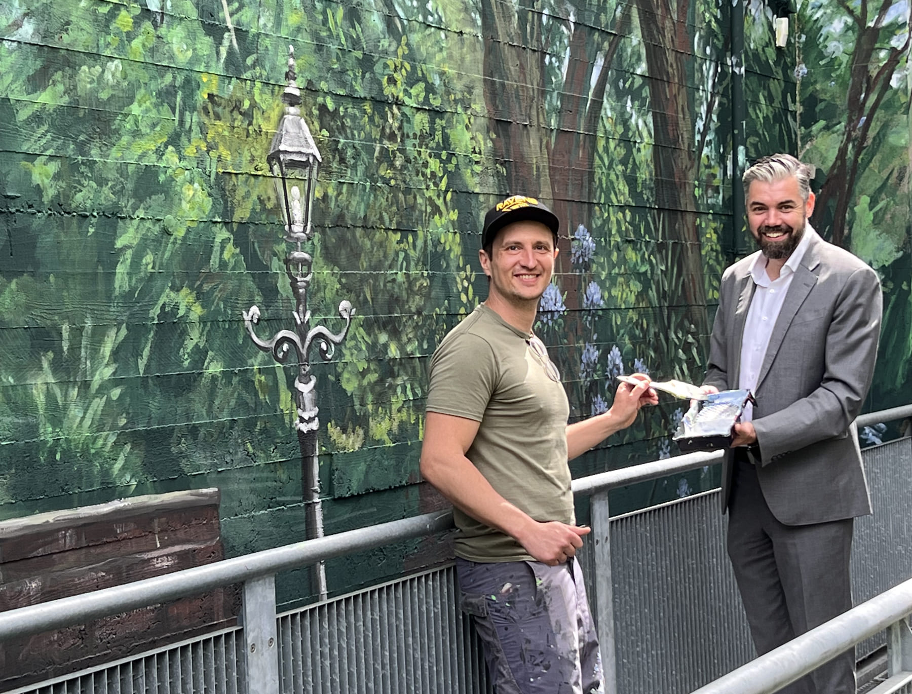 „Wie aus Farbe und einer freien Fläche in so kurzer Zeit ein solch beeindruckendes Werk entstehen kann, ist faszinierend“, betont Hoteldirektor Bart Vaessen, der Tubuku vor allem wegen ihrer besonderen Art der Gestaltung engagiert hat. Denn Jaroslaw „Jarek“ Masztalerz und Alex Weigandt, die sich hinter dem Namen Tubuku verbergen, beziehen in ihrer Gestaltung stets die Umgebung mit ein. So scheint sich die gerade üppig blühende Gartenanlage vor den Fenstern des Hotels entlang der nun gestalteten Seitenwand bis in den neuen Fitnessraum fortzusetzen, wo sie in zarten Farbnuancen abstrakt ausläuft. „Für die Gestaltung haben wir keine Spraydosen genutzt, sondern Acrylfarbe, die wir mit Streichrollen aufgebracht haben“, erklärt Alex Weigandt, der wie Jarek Masztalerz Kommunikationsdesign studiert. „Bei unserem Design ist das Besondere, dass wir Mischtechniken verwenden. Denn indem wir die Farbe noch nass verreiben oder mit der Streichrolle entlangziehen, erzielen wir einzigartige Wirkungen.“ Bei der Gestaltung der großen Wandfläche im Hotel Krefelder Hof haben die beiden Designer, die sich selbst nicht als Künstler bezeichnen möchten, erst einmal die Umgebung auf sich einwirken lassen. „Die Struktur der Wände und die Art wie das Licht darauf fällt, verleihen der Fläche schon eine Lebendigkeit und Struktur, die wir dann mit unserem Design aufgegriffen haben“, erläutert Jarek Masztalerz den Entstehungsprozess. Entstanden ist nun ein Naturszenerie mit vielen feinen Schattierungen, voller Farbintensität und Dynamik, die in eine ungewöhnliche optische Beziehung zu den neuen modernen Fitnessgeräten eingeht. Der Bereich mit seinen Cardio- und Kraftgeräten kann nun von den Hotelgästen genutzt werden, um ihren Körper in einem „natürlichen“ Ambiente mit Blick in den Garten in Schwung zu bringen.