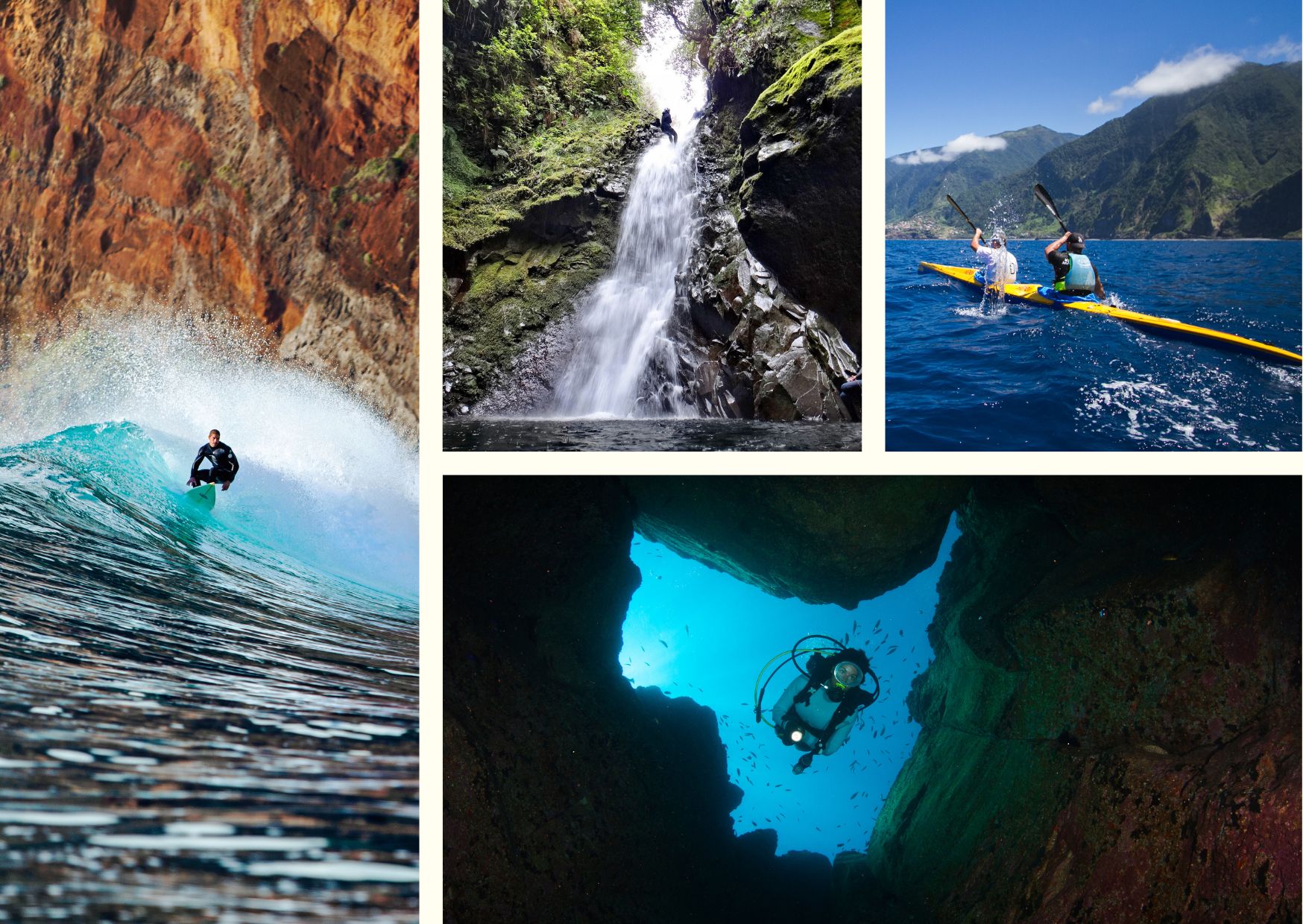 Beim Canyoning werden tiefe Schluchten und Wasserfälle in den unterschiedlichsten Varianten erkundet: durch Abseilen, Abklettern, Springen, Rutschen, Schwimmen und manchmal Tauchen. Eine weitere Wassersportart ist Coasteering. Dabei handelt es sich um eine sportliche Aktivität, bei der bergige Küstenlinien zu Fuß oder schwimmend begangen werden. Es werden dabei keine Boote oder ähnliche technischen Hilfsmittel verwendet. Schwimmen, Klettern und Springen werden kombiniert, um die Küsten Madeiras auf eine einzigartige Weise zu erleben.