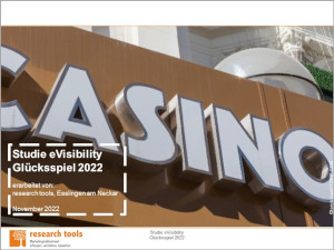 Die „Studie eVisibility Glücksspiel 2022“ von research tools untersucht auf 77 Seiten die Präsenz der Top 100-Anbieter für Glücksspiel in den vier Onlinekategorien organische Suchmaschinenergebnisse, Paid Search, Vergleichsportale, Social Media. Damit zeigt die Studie die Sichtbarkeit der Anbieter im Internet auf und gibt einen umfassenden Wettbewerbsüberblick. Ein Ranking eVisibility listet diese Anbieter unter Berücksichtigung der Kategorie- und Gesamtpunktzahl. Insgesamt 169 Anbieter sind sortiert nach Rängen.