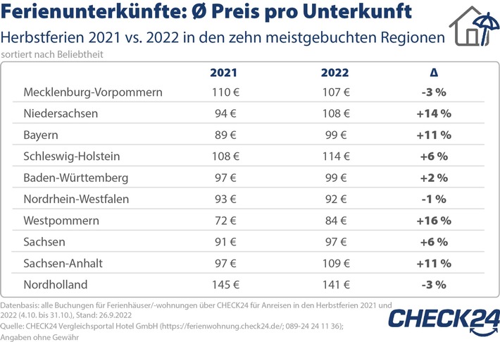 Ferienunterkünfte innerhalb Deutschlands sind trotz Ende der coronabedingten Reisebeschränkungen in den diesjährigen Herbstferien beliebt. Das ergab eine Untersuchung aller Buchungen von Ferienunterkünften über CHECK24. 2022 liegen die sechs meistgebuchten Regionen in Deutschland.