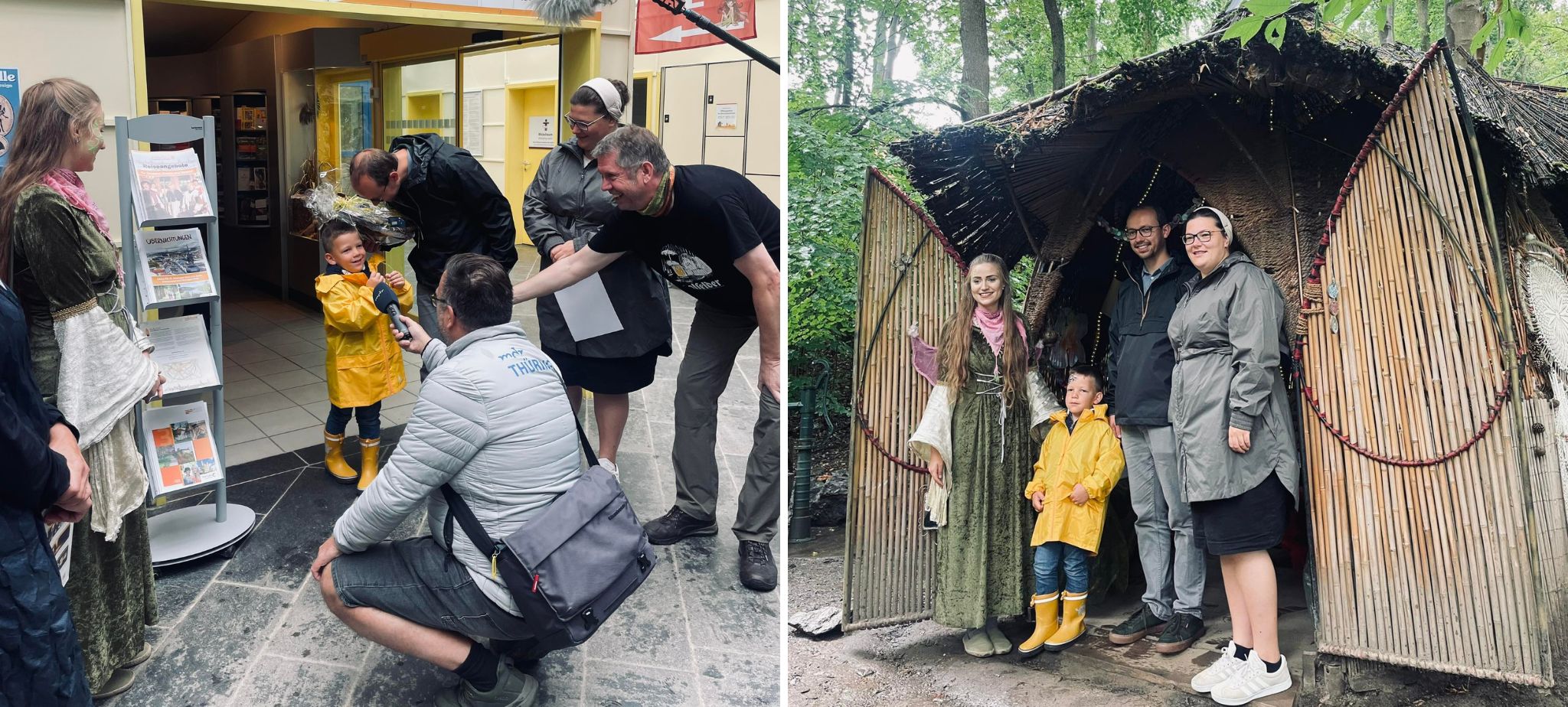 Die Geschäftsführerin der Saalfelder Feengrotten und Tourismus GmbH, Yvonne Wagner und die Grottenfee Nathalie empfing Familie Hannemann aus Untermünkheim (Baden-Württemberg). Das Dreiergespann ist das erste Mal zu Besuch im Feengrottenpark und wollen Ihren 3-wöchigen Urlaub in Saalfeld enden lassen. Sie freuten sich über eine Jubiläums-Urkunde und einen bunten Präsentkorb mit vielen Überraschungen aus dem Feenweltchen.