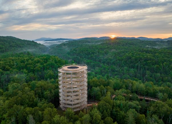 Am 24. Juli 2022 eröffnete der Baumwipfelpfad Laurentides in Quebec seine Pforten. Fortan heißt er Familien, Senioren, Menschen mit eingeschränkter Mobilität und alle ande-ren Naturverbundenen auf einem über 1.400 Meter langen Pfad inmitten des Waldes willkommen. Die neue Naturerlebniseinrichtung ist dabei harmonisch in die Umgebung integriert und befindet sich auf dem herrlichen Gelände einer ehemaligen Fischfarm des „MRC des Laurentides-, einer Verwaltungsregion in Quebec. Ein spektakulärer Aussichts-turm ragt 40 Meter in den Himmel und Besucher können bereits auf ihrem Weg nach oben die Schönheit des Baumkronendachs und sanften Wellen der alten Bergketten auf sich wirken lassen. Oben angekommen eröffnet sich ihnen dann ein atemberaubender Blick auf die spektakuläre Landschaft der Laurentian Mountains, den Mont Tremblant und den gleichnamigen Nationalpark sowie auf den Mont Blanc. Ein zusätzliches Highlight für alle abenteuerlustige Besucher ist das 70m² große begehbare Netz, das in der Mitte der obersten Turmplattform installiert ist. Wie bei allen Pfaden der Erlebnis Akademie AG er-gänzen zahlreiche Spiel- und Lernstationen das Angebot der barrierearmen Holzkon-struktion. Außerdem ist der Baumwipfelpfad von Montreal und Ottawa im Rahmen eines Tagesausfluges gut erreichbar und grenzt unmittelbar an einen der längsten Radwander-wege in Quebec.