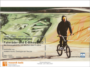 Die ‚Werbemarktanalyse Fahrräder und E-Bikes 2023‘ von research tools untersucht die Werbeausgaben für Fahrräder und E-Bikes in Deutschland. Sie gibt auf 102 Seiten Einblick in Trends, Benchmarks und Strategien und zeigt quantitative Fünf-Jahres-Trends für 200 Anbieter auf. Eine Analyse des Mediensplits zeigt die Werbeausgabenentwicklung differenziert nach Medien.